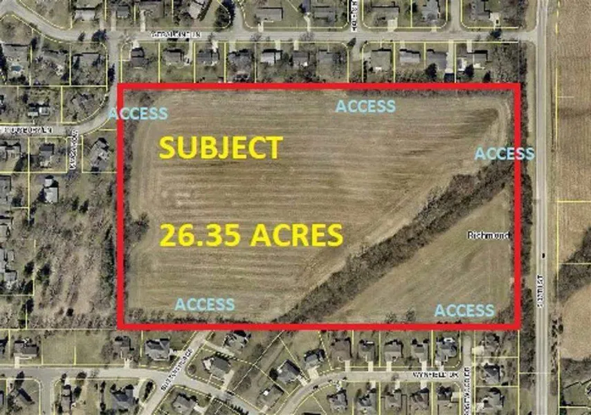 Exceptional development ground located on the sought-after east side of Richmond. This amazing 26.35 acre parcel has been off the market for over 10 years and is now available. Located in a highly desired area just minutes from the epicenter of Richmond shopping and only 5 minutes from the I-70. This one-of-a-kind piece of ground has 5 access points, including two points in the Wynfield subdivision. There have been several preliminary site drawings for this site, and it has at least 2 access points where initial development of at least 12 lots would be very inexpensive allowing for a great return on your investment. This site would also be ideal for development of a PUD including a nursing care facility, townhouses, and single-family homes. Call or text Kyle Tom @ 765.220.0199 today for additional details, to view construction drawings or visit kyletom.com for additional information.