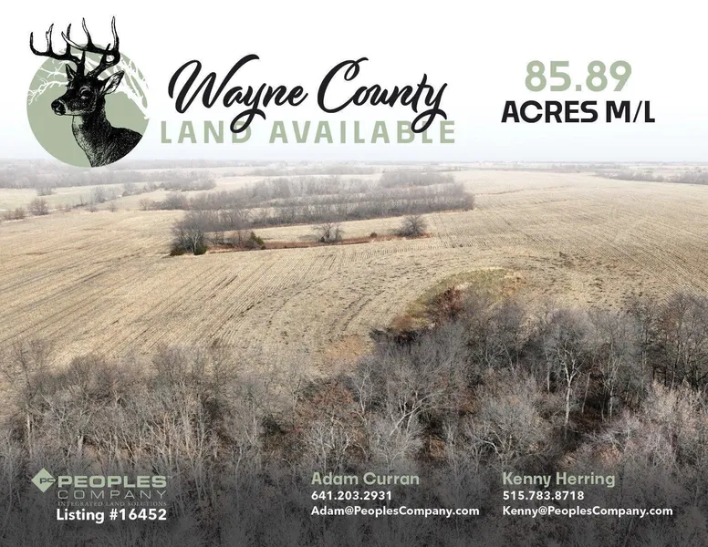 Peoples Company is pleased to present 85.89 acres m/l (subject to survey), of prime Wayne County, Iowa income producing, recreational ground; located northeast of Lineville, Iowa. Approximately 49.5 acres m/l are currently in row crop production. The dominant soil types for the tillable acres are Adair clay loam, Shelby clay loam, ShelbyAdair complex, and Vesser silt loam with a weighted average CSR2 rating of 49.5 on the tillable acres. The farm will be open for the 2023 farming season. In addition, this property offers exceptional hunting opportunities to harvest trophy whitetail deer and turkey. The farm is located in Section 22 of Grand River Township in Wayne County, Iowa.