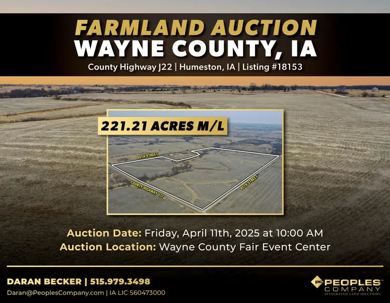 Wayne County, Iowa Farmland Auction Mark your calendar for Friday, April 11th, 2025 at 10:00 AM! Peoples Company is pleased to represent D Bar C Land and Cattle in the sale of 221.21 total acres m/l of Wayne County, Iowa farmland.