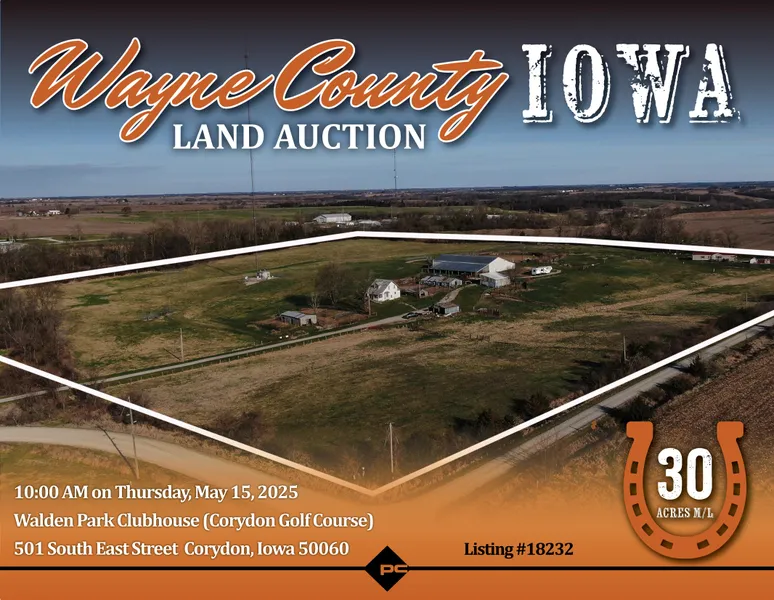 This property will be offered via a live Public Auction that will take place at 10:00 AM on Thursday, May 15, 2025, at the Walden Park Clubhouse (Corydon Golf Course) located at 501 South East Street in Corydon, Iowa. The land will be sold as 1 individual tract on a whole dollar amount basis. This auction can also be viewed through the Peoples Company mobile bidding app with online bidding available to registered bidders.