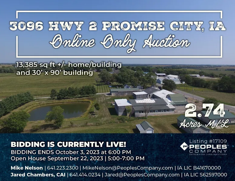 Peoples Company is pleased to offer to the public, via an Online Only Auction, the property of the David C. Eckles Estate located at 3096 Hwy 2, Promise City, Iowa. This multifunctional property includes a 13,385 sq ft +/- home/building, indoor swimming pool, 30' x 90' metal building with concrete floor and a half-acre pond all situated on 2.74 acres m/l along the western edge of Promise City. The home/building features a large open great room, commercial kitchen, 3 bedrooms, 4 full and 3 half bathrooms, indoor swimming pool, sauna room, and many other rooms that could be easily converted to fit your needs. The kitchen area has a high-dollar stainless steel commercial kitchen which overlooks two large open rooms suitable for your large family and friends gatherings. The property is heated with a geothermal heating system. Outside the home, you will find 2 large screened-in porches, a 1/2 acre pond, and a 32' x 90' metal building. The building has a full concrete floor, two overhead doors with openers, and electric service making it the perfect shop for all of your needs. Any remaining personal property located on the property at the time of closing will be included as part of the sale.