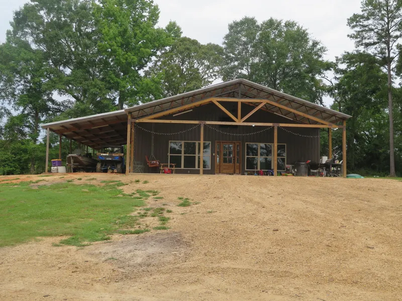 Surrounded by mature pine trees and hardwoods at the top of a hill is this unique barndominium home. With its work-in-progress state, it has a charming 800 sq ft finished living quarters that includes a kitchen, bedroom, bath, laundry, and living/dining area. Due to the Seller's growing family, he has outgrown this area and is finishing the remainder of the 40X60 building sparing no costs. Walking into the great room will take your breath away! Tall ceilings with exposed metal rafters, tongue and groove pine ceilings, Chicago brick floors, and an open concept into the dream kitchen is hard to take in. The cook's kitchen features a large island with seating, a farm sink, granite countertops, a large pantry closet, and custom built cabinets. There are lots of windows in the kitchen and living space for you to enjoy the outside while preparing your meals. A cedar closet in the hall and a built-in gun safe are added features. A large mud/laundry area with a door leading outside will be convenient when finished. Plans are to add another bath to the finished main bedroom and a door to access the finished apartment area in the back from the hallway. A large 40X40 room upstairs is accessed from the mud room, which could be another bedroom or man-cave. With country living at its finest, you'll want to be outside, so the 14X40 porch across the front gives you lots of room to grill and entertain. Wind down your day by sitting on the porch in your rockers or porch swing and look out across the pond located in your front yard. There is a 18X60 lean-to carport across the side to park under, and great for keeping your extra's out of the elements. Situated on county lines, it gives you the opportunity of two school districts to choose from; you're only 5 miles from the nearest town and 7 miles from Interstate I-59. If you want quiet country living, this property is what you've been looking for. Give me a call to schedule your appointment only showing!