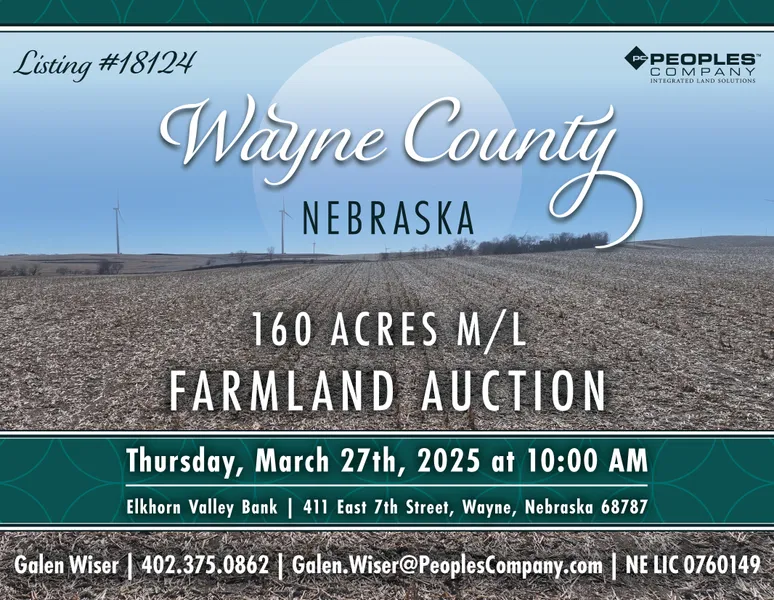 Wayne County, Nebraska Farmland Auction Mark your calendar for Thursday, March 27th, 2025! Peoples Company is honored to represent the Ames family in selling 160 acres m/l of prime Wayne County farmland. The farm consists of 152.19 tillable acres carrying an NCCPI of 73.4, with productive soils including Moody silty clay loam, McPaul silt loam, and Kennebec silt loam.