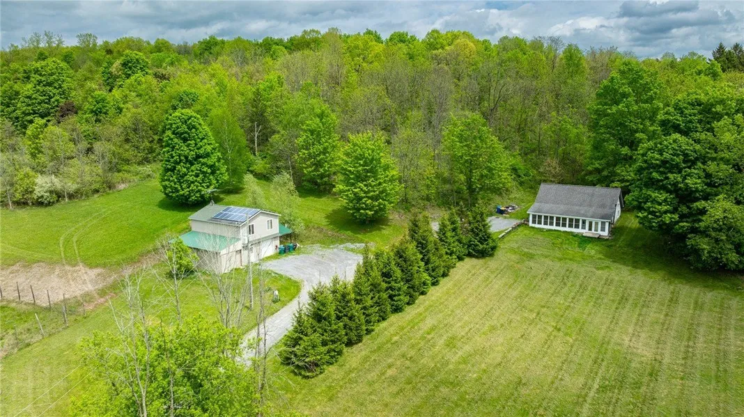 INCREDIBLE AND RARE OPPORTUNITY! TWO PROPERTIES ON ALMOST 7 ACRES! Palmyras hidden gem welcomes you! Tucked back down a long driveway you will find a main house featuring an eat-in kitchen with vaulted ceilings overlooking a spacious living room, two first floor bedrooms, first floor laundry, first floor full bath a finished second floor space as well as two open loft areas. This home has a spacious enclosed front porch and overlooks a massive, beautiful lot with complete privacy. Your very own staycation with cabin vibes. The detached garage has an apartment above it featuring a living room, dining area, kitchen, bath and one bedroom in the unit as well as one bedroom downstairs as well as laundry downstairs. This unit overlooks another beautiful open yard. Both homes are serviced by separate utilities (except water) including separate banks of solar panels. Solar panel system is set up for expansion with additional panels or a wind turbine. This is a great opportunity for investors or an owner occupied with rental income to help pay your mortgage. The main house is currently rented on a month to month lease and tenant has great rental history who would love to stay or can vacate for owner occupants! The apartment is also tenant occupied, month to month. There is also a timber stand that Cornell CO-OPs master foresters said would be ready for harvest in about 5-8 years consisting of mostly Cherry, Silver and Red Maple with a few Oaks! This property is very unique, a MUST SEE!