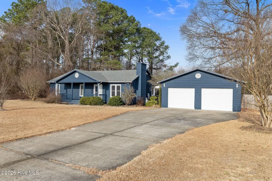A true country charmer with no restrictions, situated on approximately .95 acres of unrestricted land and offering both privacy and flexibility. The freshly painted exterior gives this home a like-new feel, complemented by a charming stone walkway leading to the entrance and a detached two-car garage. Inside, the open-concept layout features durable solid-surface flooring throughout, including laminate and tile, and a spacious living room highlighted by a cozy gas fireplace. The kitchen and dining area are well-appointed with updated wood cabinetry, tile flooring, and Staron surface countertops, creating a functional and inviting space for everyday living and entertaining. A convenient hall laundry closet adds practicality. The home offers three bedrooms and two full bathrooms, including a primary suite with laminate flooring, two closets, and exterior french doors that open directly to the back deck. The primary bath features a granite single vanity with plumbing already in place for a second sink, along with a tub/shower combination. Outdoor living continues with a screened porch accessed from the dining area, overlooking a generously sized, privately fenced backyard ideal for relaxing or entertaining. Additional updates include a roof replacement in 2021 and an energy-efficient HVAC system installed in 2025, making this property a well-maintained and move-in-ready retreat with country charm and modern convenience. Located outside of the city limits, yet conveniently close to Goldsboro, Mt. Olive, and the back entrance to SJAFB.