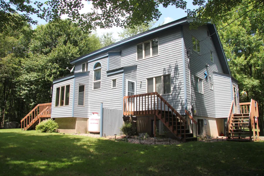 Country contemporary home offering 3 bedrooms and 3 baths, bright and airy living area with tongue & groove beamed ceilings and propane fireplace, open floor plan, sun room and lower level family room. Beautiful wood accents, Located in a quiet area, but still just a short walk to the beach. Master Bdrm w/ walk-in closet. Private bath w/ jacuzzi. Home recently painted and stained. New roof. Thermos insulated glass doors & windows Kitchen appliances 3 yrs. old.