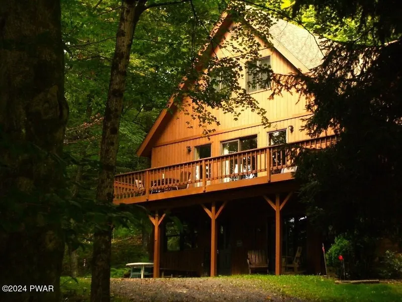 Welcome to this beautiful Chalet nestled in the hillside with an awesome country setting. This home has a nice open floor plan with plenty of room for all the family and friends. It boast 3 large bedrooms, 2 baths, a large office that could be used for extra bedroom. The living room has a wood burning fireplace which is accented by custom woodwork and large slider to access the oversized deck for all your outdoor enjoyment. There are four split units installed one in each bedroom and one on the main floor for perfect climate control. The finished lower level has a built in bar area with a large family room for everyone to enjoy. There is also a bonus room that could be used as an office or extra sleeping area. This is located in The Forest Glen Community which has access to Wallenpaupack Creek which runs into Lake Wallenpaupack. You are only 3 miles to 3 different major marinas on Lake W...