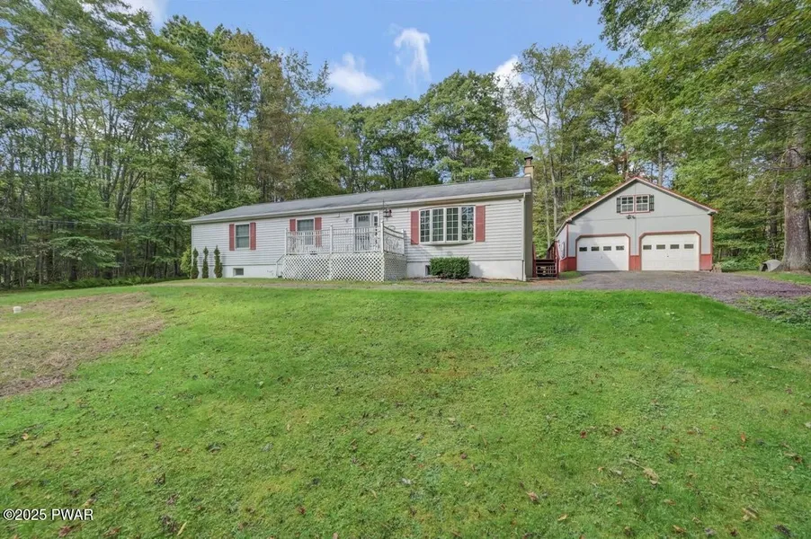 Enjoy privacy and space in this 3-bedroom, 2.5-bath ranch home with a huge detached garage, set on 2.37 acres BORDERING STATE GAME LANDS--with no community and no dues! Located on a quiet road, this property offers a peaceful setting with plenty of room to play. The home features a great layout for single-level living, including a laundry area on the main floor. The kitchen boasts a large island, gas range, ample cabinet space, and an adjoining dining area. A convenient half bath is located near the laundry and side entrance. The primary bedroom suite includes a walk-in closet and full bath, while the second bedroom also has a walk-in closet. The lower level offers high ceilings, perfect for future finishing, and includes a coal/woodstove for additional heating options. There is also a large storage area with space for a workshop or hobby area. Outside, you'll find front and rear decks (...