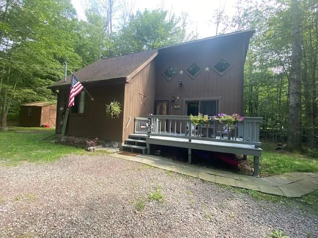 PRIVATE LAKE HOME - Perfect 3 bedroom, 2 bath sportsman's hideaway nestled on wooded parcel adjoining private 40+ acre lake for swimming, boating, and fishing. Features Kitchen with appliances, living room with wood-burning stove, enclosed porch, deck, and garage. Clubhouse, hiking trail, and more!