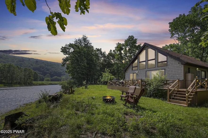Experience true serenity on the tranquil banks of the wild and scenic Delaware River in this extraordinary riverfront sanctuary, where every window captures awe-inspiring views of shimmering water, open skies, and the rolling countryside beyond. This enchanting chalet-style home combines rustic charm with modern elegance, offering easy, level river access for kayaking, fishing, paddleboarding, or simply unwinding by the gentle current. Step inside to an expansive open floor plan featuring soaring cathedral ceilings and dramatic floor-to-ceiling windows that bathe the space in natural light and showcase sweeping river vistas. The stunning stone fireplace serves as a warm and inviting focal point, beautifully accented by rich dark hardwood flooring that runs throughout the main level. The fully renovated kitchen is a chef's dream, equipped with quartz countertops, soft-close shaker-style cabinetry, sleek stainless steel appliances, and a custom tile backsplash that adds a touch of contemporary flair. The adjacent dining area flows seamlessly to a spacious deck perched above the river--perfect for savoring your morning coffee, hosting al fresco dinners, or watching eagles soar above the water. The main level offers two generously sized bedrooms and two tastefully updated full bathrooms. Upstairs, a versatile loft provides additional sleeping quarters, a reading nook, or a peaceful retreat with treetop views. Efficient ductless mini-split A/C units throughout the home ensure year-round climate comfort. Outside, immerse yourself in nature as you enjoy golden sunsets, glimpses of deer along the shoreline, and the calming sound of the river--all from your own private oasis. Whether you're looking for a full-time residence or a weekend escape, this exceptional property offers the perfect fusion of natural beauty and refined living. Don't miss this rare opportunity to own your own piece of paradise on the Delaware River!