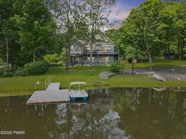 Immaculate and beautifully maintained lakefront home just 15 minutes from vibrant downtown Honesdale with three levels of spacious luxury living! This stunning custom-built retreat offers the perfect blend of luxury, comfort, and tranquility across three finished levels, all nestled on a private, lushly landscaped lot. Set on the shores of a serene, crystal-clear lake shared with only a few other homeowners, it's an ideal setting for swimming, fishing, kayaking, and peaceful non-motorized boating. Inside, the home impresses with gleaming hardwood floors, soaring 20-foot cathedral ceilings, and a sun-drenched open layout designed to maximize the breathtaking lake views. The sunroom and expansive wraparound deck provide the perfect vantage point to take in the majestic scenery. The elegant kitchen is a showstopper with gleaming granite countertops, rich wood cabinetry, newer stainless steel appliances, and generous seating space, ideal for entertaining. The main level offers a spacious primary suite with a walk-in closet, a luxurious full bath featuring a walk-in shower, and a convenient laundry area. The spectacular living room, anchored by oversized windows, frames captivating views of the sparkling water. Upstairs, the large loft--perfect as an office or guest space--shares the floor with a second bedroom and another full bath. This level features plush newer carpeting, baseboard heat, a mini-split A/C unit, and two recently installed energy-efficient heat pumps with A/C for year-round comfort. The finished walk-out lower level includes a cozy family room with propane fireplace, a third full bath, and direct access to a covered patio and private dock. Additional features include a one-car garage under the home, a detached two-car garage with greenhouse, utility shed, and freshly painted interior and exterior. This maintenance-free, move-in-ready lakefront gem is a rare opportunity--don't miss it!