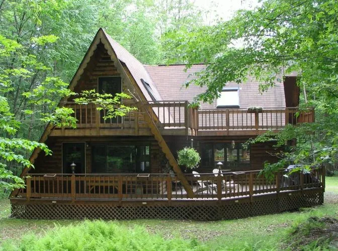 Walk to lake. Very private. 2 small studios could be bedrooms. Property has stone walls, garden and a nice lawn. Large deck - very private. Community has its own 50 acre (+/-) lake for swimming, boating and great fishing. Close to stores and school.