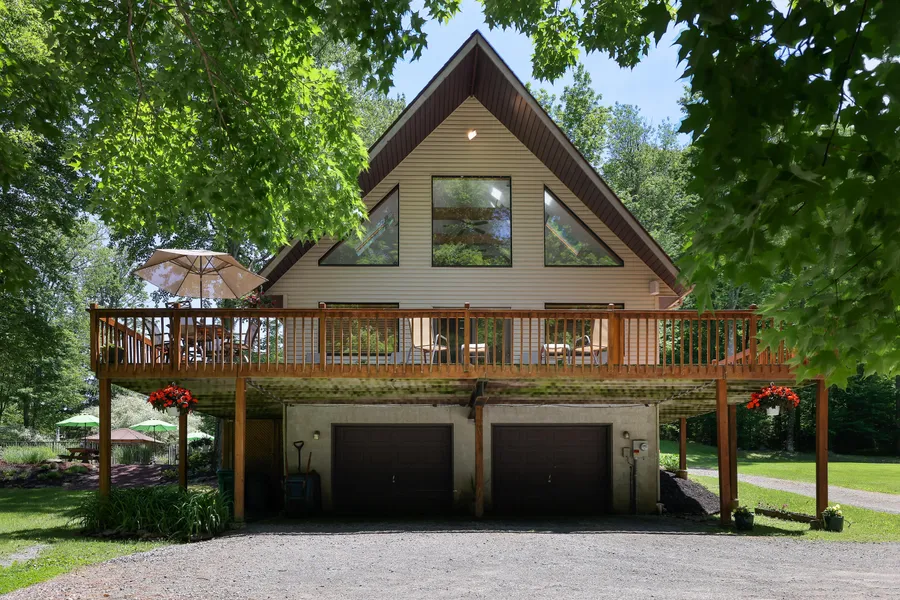 Exciting 4 bedroom, 2 bath country contemporary nestled on choice 6 acre estate parcel with manicured grounds and postcard settings. Features include picturesque stream and inground pool, bright and airy living area with glass facade, beamed cathedral ceilings, entertainment center and modern kitchen with granite and luxury appliances. Expansive sundecks overlooking tiki bar and swimming pool complex surrounded by manicured grounds. Full basement, garage, and conveniently located only minutes to town. So much more!