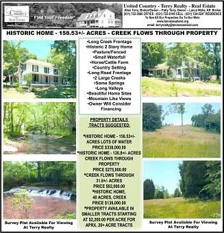 MOTIVATED SELLERS, PRICE REDUCED BY $78,000! NOW priced at $338,000.00 for all 158+ acres and home (LISTING#41099-20820). The historic home built in 1927 is said to a Sears and Roebuck home. It is 2 Stories with 2,088 square feet~ 1,464 square feet on the main floor and 624 square feet upstairs. The interior needs lots of work however. Board walls & ceilings in some rooms, wood floors, 3 bedrooms, 1 bath, good size dining room,sunroom & wrap around porch. New survey, the land is on both sides of a county gravel road not traveled much with an abundance of water flowing through! The house side features approximately 126 acres with Bowstring Branch flowing along the property line with waterfalls and some of the valleys have spring fed streams in them as well, nice spots to build ponds/lakes. It has rolling pasture, some of the land is also in cutover timberlands ready to easily clear off an...