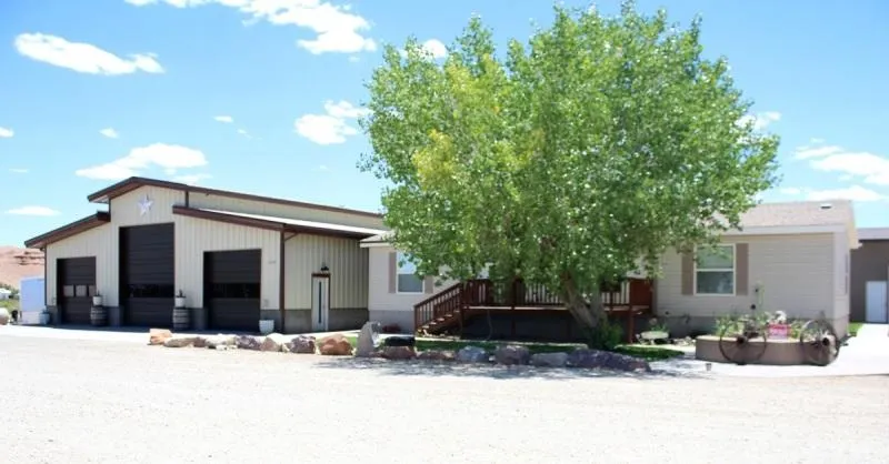 Three bedroom, two bath home adjoining a huge, first-rate 50 X 50 metal building with three roll up doors, 19 ceilings in the center and 12 on both sides. Shop is heated, cooled and double insulated, includes an office space with storage above and bathroom. Shop has one 12 X 14' door and two 10 X 10' doors. Large enough for cars, trucks, boats, trailers, and RVs to occupy all at once. An excellent space for large family gatherings, recreation activities and suitable for formal celebrations. Home is 1650 square feet and in good condition with master bedroom/bath, open living area and added great room. Easy care landscaped half acre with just the right amount of grass and shade trees. Garden bed, outbuildings and parking cover included. Vacation rentals permitted. 85 W Rookie Lane, Hanksville, Utah. $499,000