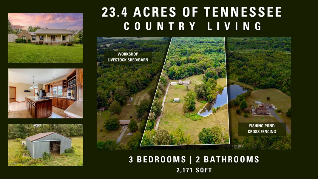 Discover this stunning custom-built 3-bedroom, 2-bathroom brick home on 23.4 acres in Tennessee, offering the perfect blend of comfort, character, and country living. With 2,171 sq. ft. of thoughtfully designed space, the home features a split floor plan with locally crafted black walnut cabinetry, a spacious kitchen with both an island and dual cooking options (electric range and propane stove), and a primary suite complete with a walk-in shower, soaking tub, and large walk-in closet. Additional highlights include a cozy sunroom, a private office, and a formal dining room—perfect for both everyday living and entertaining.