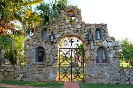 The headquarters structures are stone and stucco mission style architecture. Along with the main house, there are additional houses and living quarters, a saloon-style bar and game room, a stone fountain and gate, a patio featuring a vineyard and fireplace, an outdoor hot tub and whirlpool, and a private outdoor shower.