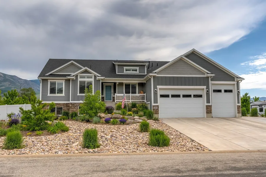 Escape to the mountains and enjoy life in this beautiful home. This home offers open concept living on the main, a total of five bedrooms, three full bathrooms, large laundry room, and another living room in the basement. Large pantry in the kitchen that is hidden behind built-in cabinet doors. There are two entertainment systems with built-in speakers that will be staying with the home. The garage is oversized with a utility sink, workbench, and there are systems in place to store all your toys (paddleboards etc.) and an overhead storage shelf. Enjoy the evenings sitting on the covered deck (Trex) or out on the patio located in the backyard where you will enjoy the views and wildlife. The lot backs up to common area so no backyard neighbors. The backyard is fenced and features several trees, wildflowers, curbing, in-ground trampoline, horseshoe pit, a swing set for the young (and old), a hammock for a lazy day, fire pit, automatic sprinkler and drip systems, and has amazing views of the mountains. Enjoy your morning coffee on the front porch where you will enjoy views of the mountains to the west and Nordic Valley ski resort. The front yard is xeriscaped so you can sit back and relax. There is a 12x18 shed that has power to it. There are two RV parking strips both on the side of the home. There is 30 amp power to the RV pad and could easily be upgraded to 50 amp. Some other features Beehive water softener, security cameras, gas BBQ hook-up on deck, ring doorbell, Nest thermostat. There is a 2" steel security door leading into the cold storage so it could also be used as a walk-in safe. Schedule a private showing today. Buyer/Buyer's Agent to verify all. Fridge, freezer, fridge in garage, gun safe, outdoor furniture, Weber gas grill are excluded but Seller's are negotiable.