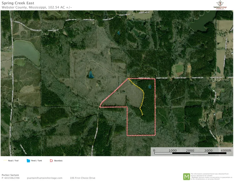 102.54 acres in Sections 23 and 26, T21N, R10E, Webster County, MS, 10 miles north of Eupora. The property has approximately 1900 feet of frontage on County Road 205 (Buster Vaughn Road) along the west boundary.