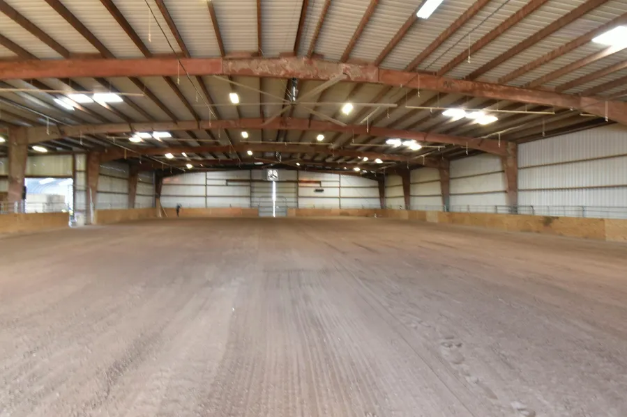 - Indoor arena features a riding space approximately 90’x180’ with optimal improved footing, overhead sprinkler system to minimize dust, improved ventilation system with BA fans, 18 stalls, 2 of which are brood mare sized, 2 tack rooms, wash bay with hot and cold water, office space, a break room, and a loft for hay storage