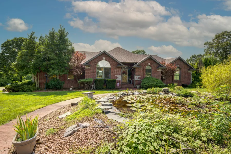 Experience the postcard worthy sunsets off your back deck while you sip a glass of wine and watch the wildlife roam. (They don't call it Deer Lane for nothing.) Just minutes outside of Springfield, enjoy the serenity and privacy for this gorgeous all brick walkout basement retreat. As you walk through the front doors, you're welcomed by vaulted ceilings and lots of natural light. Your semi open concept living room and kitchen offer a large entertaining space with access to the covered deck with water view. The kitchen has granite countertops including bar and island, walk-in pantry, plus coffee bar and access to your formal dining room. Also on the main floor is an office, hall bathroom, 1 of 2 laundry rooms, and a main floor master bedroom. Your expansive bedroom provides 2 walk-in closets, jetted tub, and walk-in shower. Moving down to the basement are the remaining bedrooms and bathrooms along with a 2nd full kitchen and bonus room - currently being used as an exercise area but could work for a playroom, wine room, etc. That space or the room under the stairs would both be good for a storm safe room. Just off the 2nd kitchen is an in-laws suite with connected bathroom, own laundry set up, and access to the covered patio. You'll also love the NEW ROOF and gutters, stunning hardwood floors, sprinkler system, wood burning stove, modern vessel sinks, storage shed, extra cellulose insulation in the attic with an R40+ rating, along with a gas powered back-up generator for peace of mind during our cold Missouri winters. Your 3 acres features a large koi pond, invisible fence perfect for pets, and lovely covered outdoor spaces overlooking a large pond stocked and ready for fishing. If you've been looking for a tranquil setting outside the chaos of the city, but you don't want to compromise convenience or cell service, this home definitely fits the bill. Plus how many people can say their property is certified by the National Wildlife Federation as a wildlife habitat?