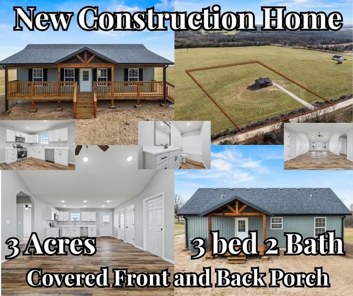 New! New! New! Welcome to this brand-new 3-bedroom, 2-bath home set on just over 3 open acres, ideal for a hobby farm or simply enjoying the open space. With expansive covered front and back porches, this is the perfect place to start your mornings with a cup of coffee while taking in the country views. Located just a little ways off of a blacktop road in the Marshfield School District, this new construction 1,200 sq ft home delivers the best of both worlds--quiet rural living just 20 minutes from Springfield and 10 minutes from Marshfield, Fair Grove, and Strafford. The thoughtfully designed split-bedroom floor plan features a spacious living area that flows seamlessly into a stylish kitchen, along with two additional bedrooms and a private primary suite with its own bathroom. Quality finishes shine throughout, including quartz countertops, soft-close cabinets, LVP flooring, modern fixtures, and tub/shower combos. High-speed internet is available, making it easy to stay connected while enjoying the freedom of country life. Whether you're dreaming of a small hobby farm or simply space to enjoy the views, this property offers the perfect balance of serene country living and convenient access to town. All financing types welcome. One-year builder's warranty included.