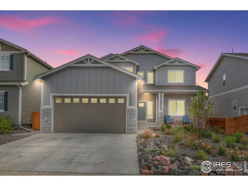 Experience Colorado living, where breathtaking mountain views & open space await you! This meticulously maintained home, cherished by its original owner, offers an unparalleled lifestyle. Step into the meticulously xeriscaped front yard, boasting a drip irrigation system for effortless upkeep. Upon entry, a welcoming foyer unfolds into a spacious office/study area that boasts awe-inspiring views that transform remote work into a joyous experience. The open-concept layout seamlessly blends entertainment & functionality, highlighted by a gourmet kitchen featuring gas range, quartz countertops, & sizable island with pantry. With an exquisite marble backsplash, stainless appliances, & stainless vent hood, this kitchen is a chef's dream. Upgraded plantation shutters throughout & lighting grace every corner of this home enhancing its elegance and style. A 3-car garage equipped with a level 2 electric vehicle charger and ample shelving, leads to a generous mudroom, perfect for storing jackets/backpacks. Upstairs you will find a spacious loft/rec area offering endless possibilities with panoramic mountain views. 3 bedrooms, including a luxurious primary suite with ensuite bathroom & walk-in-closet. A large laundry room upstairs with abundant storage & a sink simplifies laundry day. The unfinished basement provides additional storage or an opportunity for personalized expansion. Radon mitigation ensures peace of mind, while the backyard is completely fenced, expansive patio with charming string lights, planter boxes, and dog-friendly turf-ideal for low-maintenance outdoor living. A shed in the side yard offers extra storage convenience. Complete with smart thermostat, doorbell, and access to drip system. Conveniently located near HWY 66 and I-25, Mead offers the perfect balance of small-town tranquility and urban accessibility, providing an ideal setting for commuting to Denver, Boulder, or Ft. Collins.