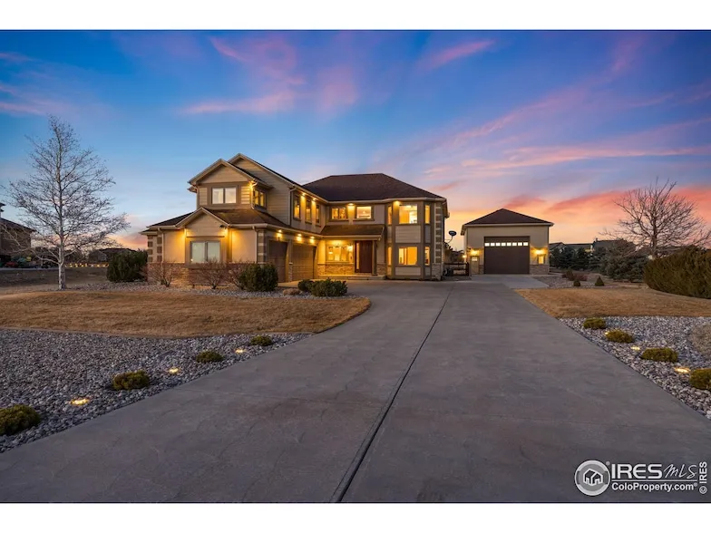 Welcome to this breathtaking home in the prestigious Soaring Eagle Ranch. Nestled on 1.6 acres, this custom-built estate offers elegance, comfort, and functionality. High-end finishes throughout this home, modern appliances, ample counter space, and a large island-perfect for entertaining. Spacious living areas blend cozy charm with upscale style. Key Features Include: 4 Bedrooms - 6 Baths, Gourmet Kitchen & Open Floor Plan, attached 3 car garage and heated detached outbuilding with 14ft. garage doors and space for RV or 6 cars. Perfect for multi-generational living. Enjoy two spacious primary suites - one on the main level and one upstairs with 3 additional bedrooms upstairs. The primary bath has heated floors. Laundry conveniently located on the main-level and upstairs for convience. There is a septic port for RV dumping to the east of the detached garage. Xfinity Internet, Comcast T.V. or Satellite. The estate is surrounded by a walking path, mountain views, and a serene pond for fishing and kayaking. Unmatched Colorado Lifestyle Relax on your fully upgraded covered patio and soak in stunning sunsets. This community offers a peaceful retreat while keeping you close to Northern Colorado's best amenities. The HOA provides irrigation water for yard and garden, and horses are welcome! Experience the perfect mix of luxury living and natural beauty at Soaring Eagle Ranch!
