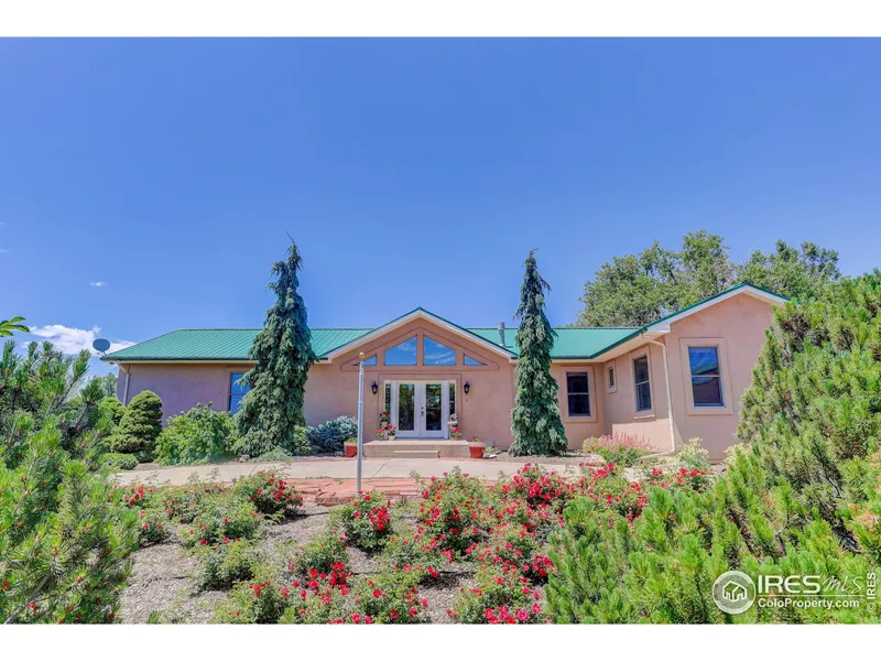 A tree lined drive welcomes you to this delightful home nestled on 5.67 acres. This ranch offers magnificent mountain views, multi-generational living, and a 60' x 40' RV garage/shop with 14' door. Light and bright great room is open to the kitchen and dining room. Enjoy meals while taking in the amazing mountain views and sunsets from the spacious nook and wrap around deck. The primary bedroom offers dual walk-in closets, a 5-piece bath with spacious low entry shower. The Mother-in-Law wing, or second primary suite which includes a full bath, sitting room and private exterior entrance. An additional bedroom and study are on the main level too! The wide stairway takes you to the finished daylight and walkout basement with amazing views, includes a wet bar, and 3/4 bath, and plenty of storage. Note the 2" x 6" construction and cross braced floors. Attached oversized 3 car garage includes wall cabinets. The RV garage/shop features a 14' door, RV dump station, bath rough-in, large loft, concrete floors, electric service, and water hydrant. Large animals allowed. No HOA or covenants allow for an in-home business. Well located with easy access to the NOCO cities and highways. This home checks multiple boxes! Schedule your showing today!