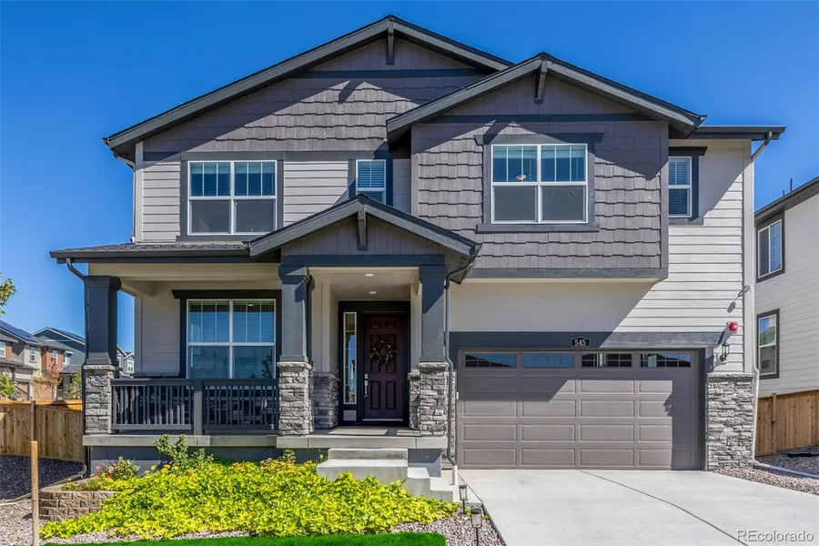 Welcome to the stunning better than new Stonehaven floorplan, perfectly situated on a desirable corner lot with views in Sunset Village! The main level is filled with natural light and offers a versatile bedroom/office, a full guest bath, EVP flooring, and a chef-inspired kitchen featuring a large eat-in island, beautiful quartz countertops and seamless flow into the soaring two-story great room. An open railing staircase leads upstairs, where you'll find the spacious luxurious owner's suite with a spa-style en-suite, a conveniently located laundry room, two secondary bedrooms with a Jack-and-Jill bath, plus a large loft with closet and views and full bath. The unfinished basement is ready for your personal touch, while the 3-car tandem garage, solar panels, and expanded covered patio add even more value. Builder warranty good through 5/19/25. All of this within Erie's charming small-town atmosphere, complete with majestic mountain views, a 63,000 sq. ft. community center, and a 20,000 sq. ft. library. Enjoy nearby shopping, dining, parks, and trails-this home truly has it all!