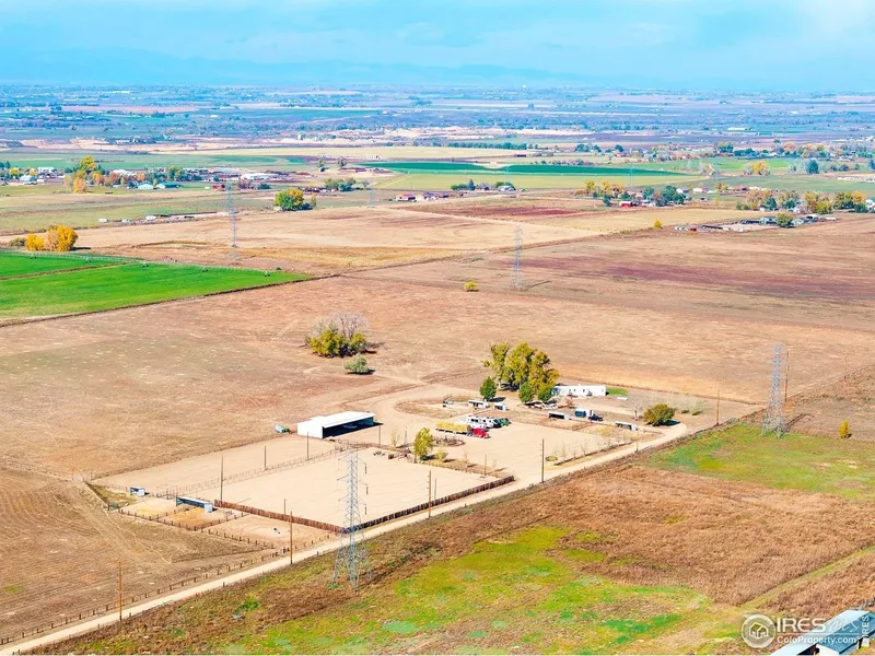 Horse-ready 78 acres just minutes East of Del Camino off paved road with sweeping mountain views! Features a 200'x300' sandy roping arena perfect for those hard rains, 40x100x16 outbuilding with 5' overhang, for abundance of hay & RV storage, 6 loafing sheds, 2001 3-bed, 2-bath nicely remodeled manufactured home. Two Central Weld water taps, ag zoning, no HOA or metro district. 60-acre solar lease in place for long-term passive income. Prime location near Hwy 85 & I-25 with development potential. Ideally situated between Denver, Boulder, and Fort Collins, this property captures the essence of western lifestyle with open space, functionality, and future opportunity. The approximate 60' diameter round pen and arena's deep, sandy footing drains fast-ideal for roping, training, or leisure riding year-round. The 40x100x16 open-faced outbuilding includes a 5' overhang which easily accommodates hay storage, long LQ trailers, RVs, or large equipment, while six well-built loafing sheds offer excellent shelter for horses and livestock with 5 automatic waters. The 2001 Lancaster 3-bedroom, 2-bath home has been tastefully remodeled to balance comfort and practicality, featuring open living spaces and mountain views with a massive 9'x5' granite center island as the focal point. Two Central Weld water taps are installed, ensuring flexibility for expansion or future development. A 60-acre solar lease is secured and set to produce long-term passive income, blending agricultural heritage with renewable potential. The land is ag-zoned with no HOA, covenants, or metro districts, providing freedom to grow or develop as desired. With quick access to Highway 85 and I-25, the location offers both rural tranquility and modern convenience-minutes from Firestone, Fort Lupton, and Longmont. Whether you're building a horse operation, seeking sustainable income, or exploring Weld County's strong development corridor, this property stands ready for your vision under Colorado's open western skies
