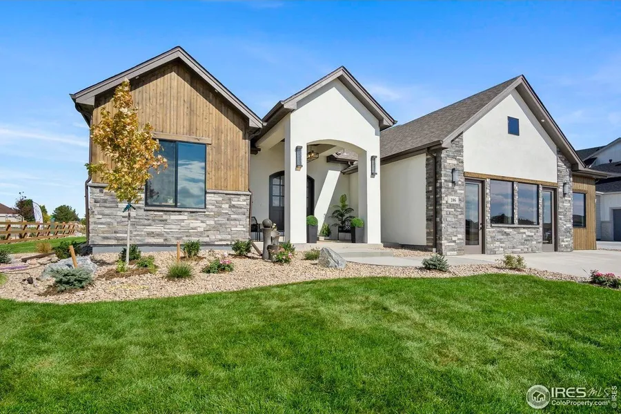 This former ranch style model home sits on a premium south facing corner lot in the highly desired Greenspire at Windsor Lake community. Designed to make a lasting first impression, it features elevated finishes and thoughtful details throughout. With a greenbelt as the backdrop and no rear neighbors, the outdoor setting feels open, quiet, and perfectly connected to nature. From the moment you step through the arched front doors, the interior feels bright and inviting with vaulted ceilings and expansive windows that frame the Colorado sunshine. The open layout flows naturally between the kitchen, dining, and great room. An oversized linear fireplace with an extended hearth creates a warm focal point for relaxed evenings or memorable gatherings. The gourmet kitchen makes a statement with its dual island, quartz countertops, gas range, custom cabinetry, beverage fridge, and secondary prep sink. It is a space that works beautifully for hosting friends, preparing family meals, or enjoying slow mornings with coffee. The primary suite is tucked away for privacy and lives like a retreat, complete with a freestanding soaking tub, walk in shower, and dual vanities. A shiplap ceiling, exposed beam, and a private fireplace add character to the space. Downstairs, the finished basement offers room to spread out with a large recreation area, two additional bedrooms, a full bath, and a wet bar. A dedicated theater room makes movie nights and game days feel special. A spacious three car garage provides room for storage, hobbies, and all the gear that comes with Colorado living. Full yard landscaping is included so the home is ready to enjoy on day one. Schedule your private tour today and experience the best of life at Greenspire at Windsor Lake.