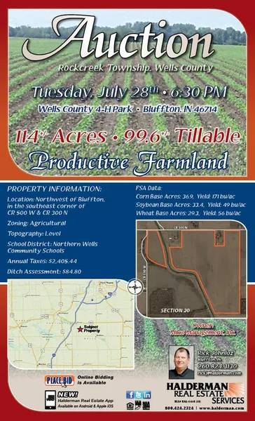Legal Description: 114.39+/- acres located in part of the N 1/2 of S20, T27N, R11E, Rock Creek Twp, Wells County, State of Indiana.