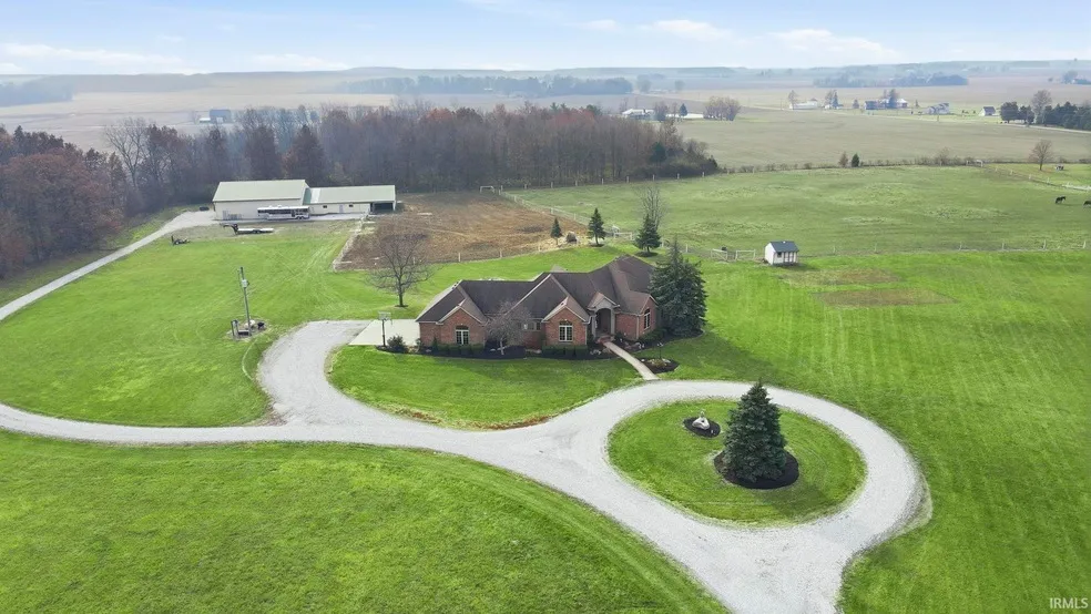 Beautiful 27+ acre country retreat ideal for horse enthusiasts or anyone seeking privacy and space. Just 20 minutes from Fort Wayne and 10 minutes from Norwell. Enjoy mature trees, open fields, and a scenic 2.5-acre stocked pond an exceptional blend of luxury living, functional equestrian amenities, and peaceful country surroundings. The custom all-brick ranch offers just over 4,800 sq ft with 4 bedrooms, 4 full baths, and 2 half baths. The foyer opens to a spacious great room with tray ceilings and a wall of windows overlooking the property. A 3-way fireplace is shared with the gourmet kitchen featuring quartz countertops, stainless-steel appliances, an island, coffee station, stacked double oven, and breakfast nook. A formal dining room and private office with French doors and built-ins add flexibility. The main-floor primary suite is its own private retreat with a large walk-in closet...