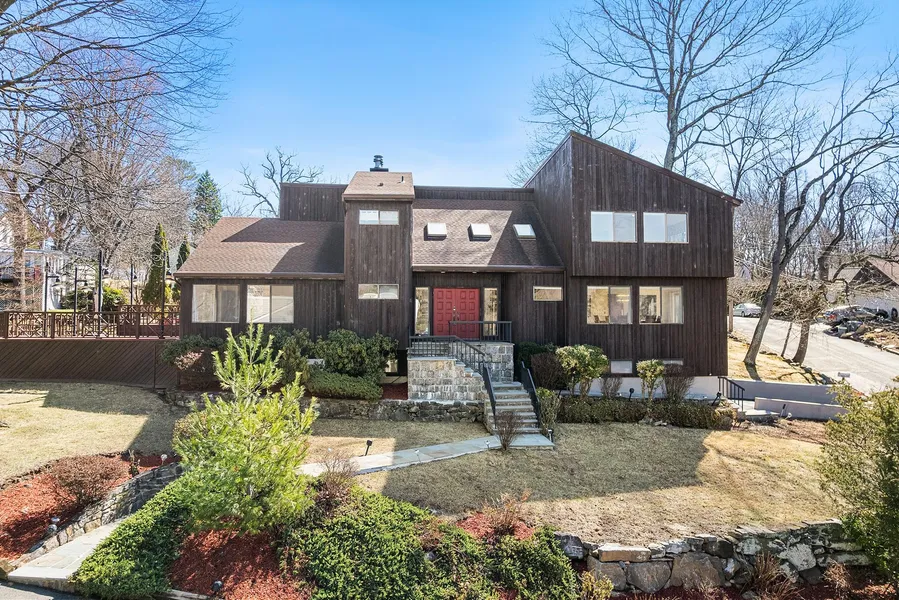 Fabulous 5 BR/3.5 Bath Contemporary style home nestled amid the privacy of its mature trees and lush plantings, this expansive residence offers an inviting atmosphere with its large 2 story entry hall and an open floor plan that seamlessly blends indoor and outdoor living. This home features a wide-open floor plan that allows for effortless flow between the living, dining, kitchen and large sunroom areas. Soaring ceilings and expansive windows ensure that each room is bathed in sunlight, creating a bright and airy ambiance. The modern chef's kitchen is equipped with Viking appliances, sleek countertops, and ample storage, designed for both everyday cooking and entertaining, with a large island that doubles as a casual dining spot, a desk area and open to the Living room with fireplace/built-ins with easy access to the huge sunroom that leads out to the patio and extensive multiple decks ...
