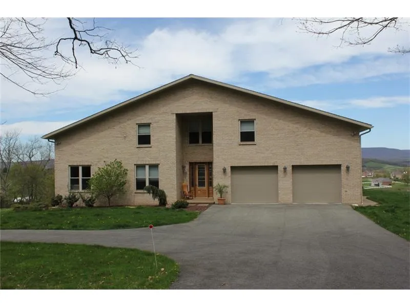One of a kind. Spectacular view overlooking town of Ligonier. Private beyond belief. Cannot see house from the main road and then it opens up displaying the brick home. Spacious entry leading to center of the home dining room. Then to the cathedral ceiling, stone from floor to ceiling gas fireplace. Gorgeous lead glass matching door from front to dining room. Island kitchen with all top of line appliances. Geo thermal heating with two furnaces. Public water and sewage. Open spacious upstairs theater/game room overlooking family room. Main office upstairs looking down into family room. Master bedroom suite with huge shower. Matching walk in closets. Ideal retreat house or family living.