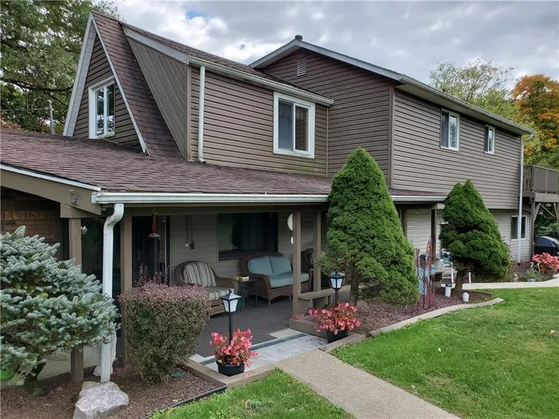 Your dream home, a cabin in the woods...let's notch it up to 1.66 acres, right off of Rte 51. You'll feel like vacation every day with this 3 bedroom, 3 bath home. Large rooms throughout. Stone flooring in the open livingroom with stone bar, office area. Beamed ceilings accent the knotty pine walls and the Anderson windows stream the sunlight in. Every room is open and airy. The dining/livingroom has an open floor concept with a breakfast bar, corner sinks and so many cupboards throughout. There's even a full bath and garage nearby. Up the steps, the knotty pine walls continue with 3 bedrooms and 2 full baths. The closets are amazingly large and the ohhh that master suite. Not only a full bathroom, but sliding doors to a 23x17 private deck that overlooks the private acreage. Not tempted yet? How about an attached garage, 2 car detached garage, storage building and a another outbuilding for that he/she shed. Add a 1 year HSA home warranty and you have the complete package.