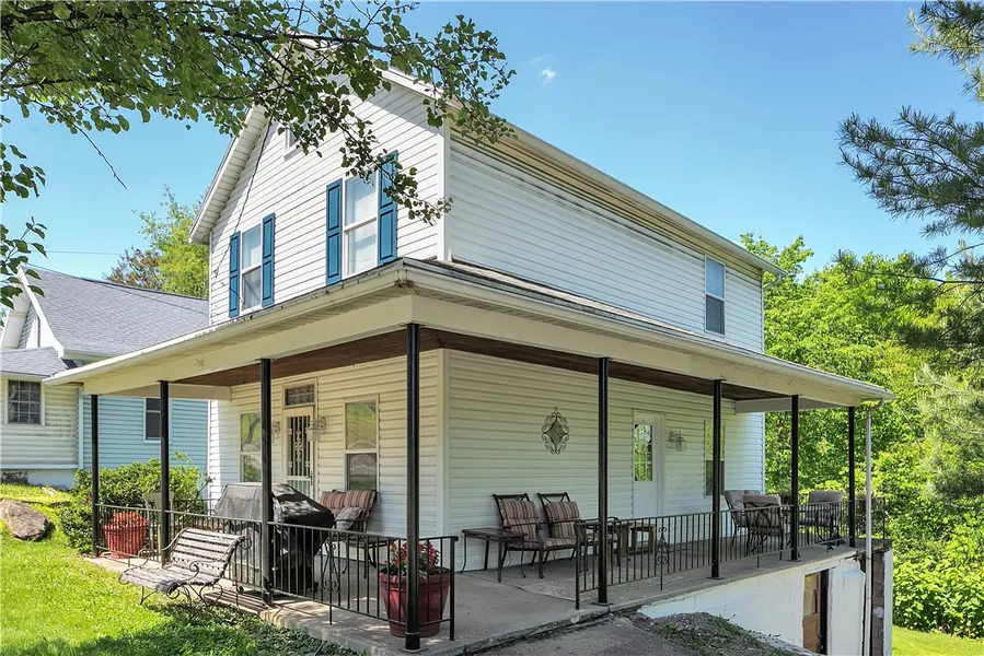Say hello to this charming 2 bedroom, 2 bath home! Enjoy the fresh paint and new carpet throughout. The custom mini blinds and new light fixtures/ceiling fans are a great finish! The main floor welcomes you with a spacious living room, dining room, and kitchen. Upstairs, find two generously sized bedrooms with ample closet space, along with a full bath featuring a new vanity. Need extra storage? No problem! A walk-up attic provides the perfect solution. Outside, enjoy 1.875 acres complete with a large 2-car garage and extra off-street parking. Sip your morning coffee on the inviting wrap-around porch. Plus, enjoy the perk of super low taxes, making this home not only charming but also affordable. Move-in ready