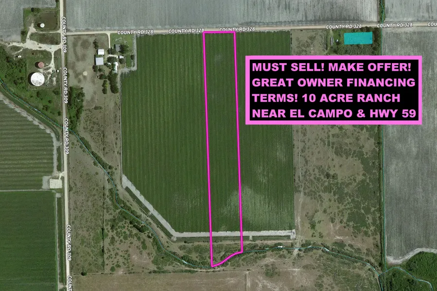 Owner Financing Available with Easy, Excellent Terms! Owner Must Sell, Make Offer! 10-Acre Ranch w/CR 328 Frontage Near El Campo & Hwy 59. Double-Wide Manufactured Home is Allowed w/Minimal Restrictions (see Appendix A - Restrictions in Docs)! Pictures were taken from all the lots that were being sold together. Needs Well/Septic Installed. Outside City Limits. Property is 9 Miles South of Hwy 59 & 13 Miles South of El Campo. 27 Miles West of Bay City & 27 miles North of Palacios/Matagorda Bay. 30 Miles to the Gulf Beaches. 50 Miles East of Victoria. 70 Miles West of Freeport Chemical Plants.