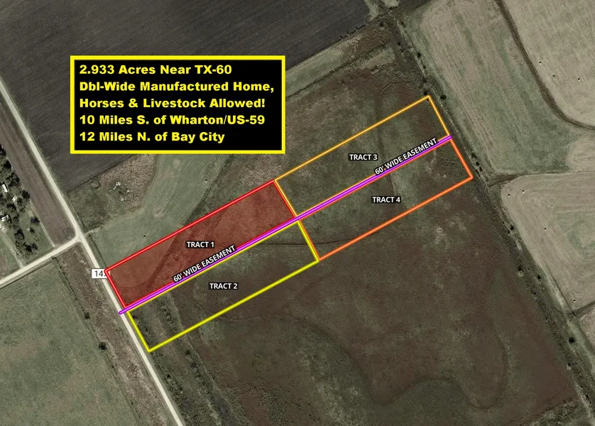 Seller Financing Available! Rare Find! 2.933 Acres Near TX-60 about 10 Miles South of Wharton/US-59 & 12 Miles North of Bay City. Horses, Livestock & Double-Wide Manufactured Home Allowed with Minimal Restrictions (see Restrictions in Docs)! It is located next to Country Living RV Park (12103 CR 147). Tract 1 is part of 10.866 Acres that is being subdivided into 4 tracts (Tracts 1-4). There is 60 ft Wide Road Easement that runs along southern border of property to allow Tracts 3 & 4 road access to CR 147 (see survey). Currently all 4 tract are available for sale! Listing Price is for only Tract 1 - 2.933 acres which is on the NW Corner & has CR 147 Road Frontage & has Well (Buyer Will Need to Inspect). Needs Septic. Wharton has 11 parks with beautiful walkways along the Colorado River, antique shops/old town shopping, restaurants & 20th Century Technology Museum. The Riverfront Park in Wharton is on the Colorado River with picnic tables, barbecue pits & restrooms where you can enjoy fishing from the pier or hike/ride bike on nature trails. Dinosaur Park also in Wharton features a life size Dinosaur sculpture. 45 Miles to Sugar Land & Angleton. 40 Miles to Matagorda Bay Fishing/Boating & The Gulf Beaches. 56 miles to Lake Jackson & Freeport Plants. 67 Miles to Houston & 71 Miles to Victoria. Total of 10.833 acres is available for sale. Property has well (Buyer needs to inspect) but no septic.