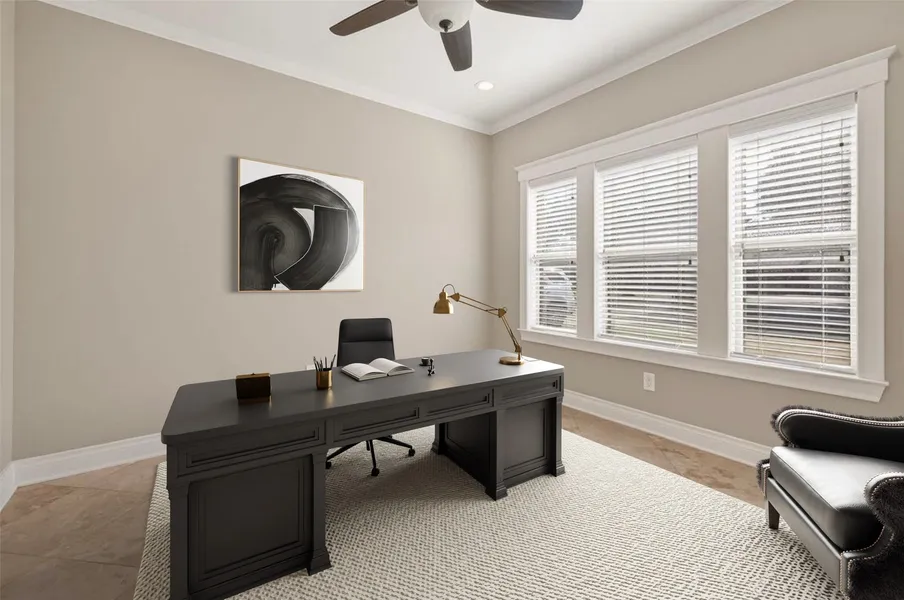 Open-concept design showcasing custom cabinetry and detailed millwork, paired with energy-efficient construction and elegant interior finishes. Spacious bedrooms feature walk-in closets, while the upstairs game room with balcony overlooks the living area and front entry. The home offers natural stone countertops, travertine tile, and laminate wood flooring throughout, complemented by indoor and outdoor LED lighting and a covered back patio. Thoughtful details include hardwood-framed windows, oil-rubbed bronze fixtures and hardware, soft-close drawers and hinges, and a fiberglass front door with rain glass and wrought iron accents. High vaulted and tray ceilings add architectural interest. Located within walking distance to award-winning East Bernard ISD, with access to the community pool and park for relaxed, everyday living