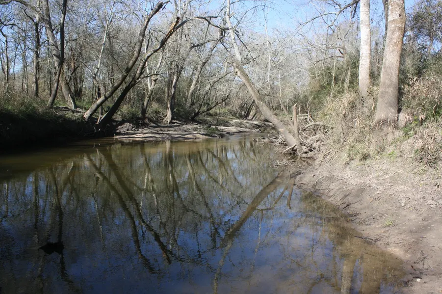 SHAPE/TERRAIN: It is basically rectangular in shape and has mostly open, level terrain utilized as row-crop farmland. The land does slope at the rear, west end of the property and has some wooded terrain adjacent to the West Bernard Creek on which it has about 4/10 mile of accessible creek frontage. The creek is typically a shallow, winding creek with fairly clear water and small sand bars.