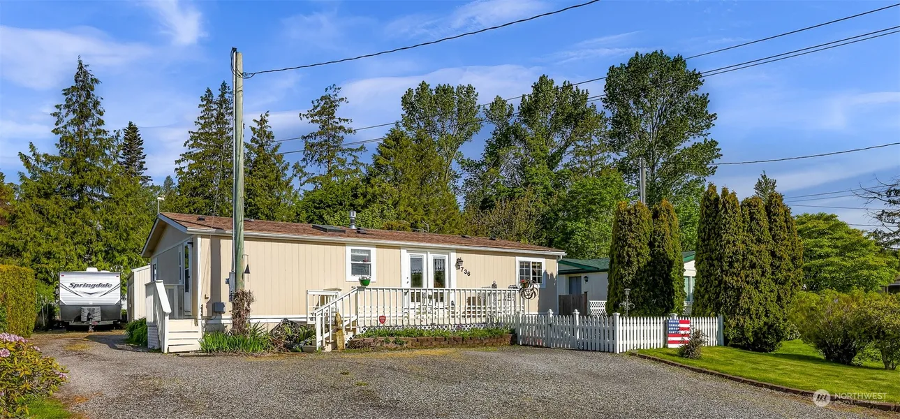 Water view home with a nice amenity package. Newer primary bath, ductless mini split system, free standing gas stove, detached two car garage, RV parking, newer hot tub, and a golf course, pool, and tennis court, just a few steps away. Easy care laminate flooring and a breakfast bar in the kitchen. Private fenced area with a hot tub and another fenced sitting area in the front of the home. Easy 10 minute drive to Ferndale and 20 minutes to Bellingham.
