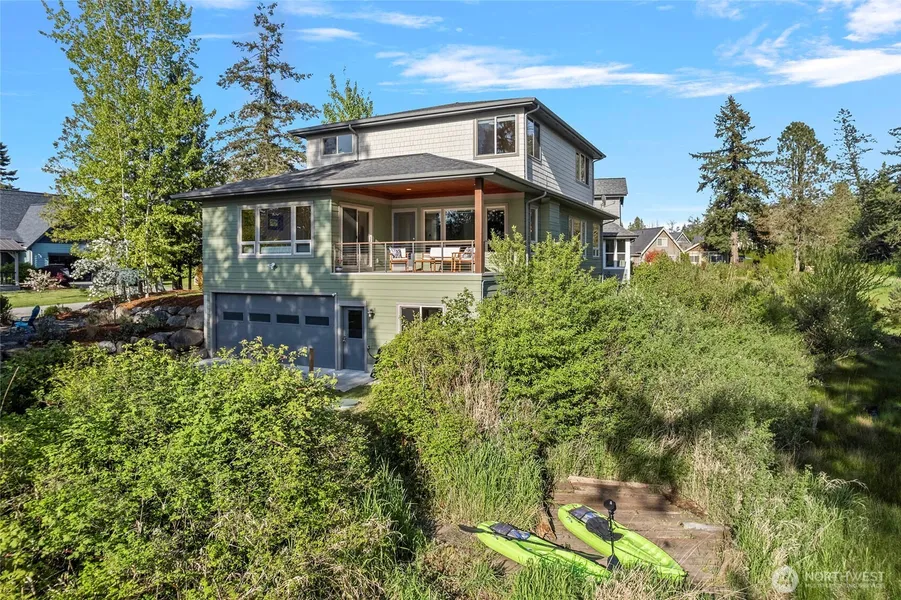 Welcome to your custom contemporary built Harbor Shores home with water views, including 4 bedrooms with a spacious bonus room including a closet that could be a 5th bedroom. Nestled by a wooded creek-perfect for watching wildlife on Drayton Harbor. The single level living on the primary floor features include vaulted ceilings, a gas fireplace, gourmet kitchen, guest bath, spacious laundry, living room and renovated primary suite including a soak-er tub. Radiant heat, central vacuum, fresh interior paint, wine room, abundant storage and smart lighting add refined living. The private entrance to the lower level features an enclosed shop with a sink for today's catch, guest kitchenette with ADU potential for additional income or guests.