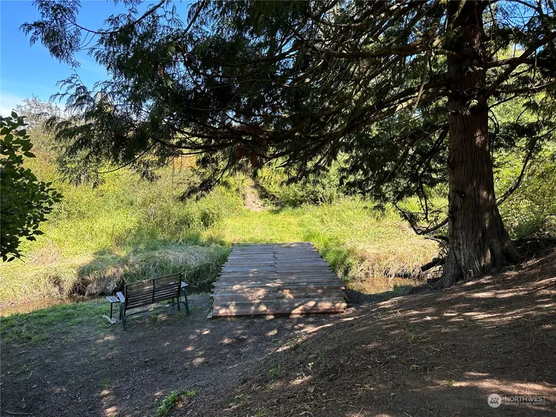 5.4 acres zoned residential with water, sewer, power, and gas in the street. Walking bridge is in for crossing Deer Creek to a large building site. City water and sewer is in the street. Right now, build your off-grid home. Great location for solar powered house. There is approximately 2 to 3 acres of level building area surrounded by waterfront.