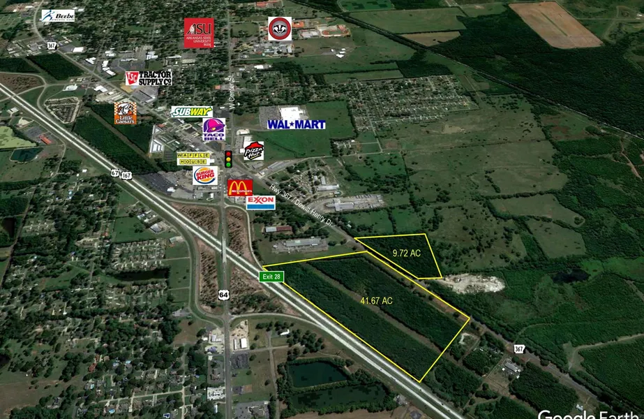 Prime location in Beebe w/superior visibility from Hwy 67/167; future I-57! Property fronts W. Dewitt Henry/Hwy 367 & backs up to freeway at the first Beebe Exit 28 (Hwy 64). Just 1/2 mile from Walmart Supercenter & other retail & hospitality. Property is mostly level, inside city limits, w/city utilities available including water, sewer & gas. Excellent location for large commercial development, multi-family or industrial. Quick, easy access in all directions! Call for more information.