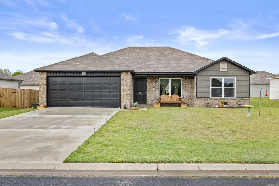 Welcome to this meticulously maintained 3 bedroom, 2 bathroom home, with a separate laundry. Step inside to find 10-foot ceilings, elegant crown molding in the kitchen, and durable LVP flooring throughout. The open-concept layout features Cheyenne-style doors, energy-efficient LED disk lighting, and double windows creating a bright and welcoming ambiance. The kitchen is a standout with a deep double sink, a spacious pantry, and upgraded finishes—perfect for both everyday living and entertaining. Both bathrooms include upgraded toilets for modern comfort, and the home is loaded with thoughtful touches like a doorbell, a fully painted garage with motor and remotes, and outdoor accent lighting to highlight the home's curb appeal. Enjoy the partially fenced backyard ideal for pets, play, or relaxing evenings. Located in a highly rated school district with quick freeway access, this home is perfect for commuters and families alike. A home warranty is included for added peace of mind. Washer, dryer, and refrigerator convey. Don’t miss your opportunity to own this move-in ready gem! **SEE AGENT REMARKS**