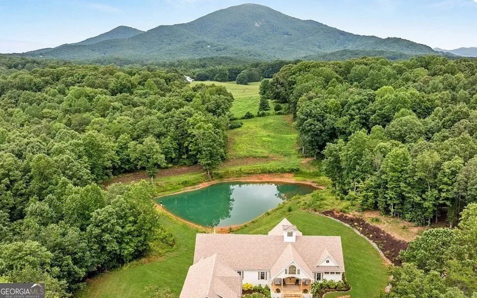 Discover a masterpiece of modern craftsmanship and natural splendor. Perched on 13.21 serene acres, this 2022 custom-built estate offers an experience of refined mountain living with staggering, uninterrupted views of Mt. Yonah from nearly every room. This is not just a home; it is a destination. Step inside to a sprawling single-level layout of 3,708 sqft, where a true open-concept design is taken to new heights. Soaring vaulted ceilings, accented by magnificent white oak beams milled from trees on the estate itself, draw the eye upward. Ten-foot ceilings and eight-foot doors create a sense of grandeur, while a real, functional cupola bathes the great room in glorious natural light. Two stately Texas limestone fireplaces provide a warm and inviting ambiance for quiet evenings or grand-scale entertaining. The luxurious primary suite is a private retreat, offering generous space, comfort, and a spa-like bath designed for ultimate relaxation. Every bedroom, along with the gourmet kitchen and main living area, is perfectly positioned to capture the majestic mountain vistas. A dedicated office provides a tranquil workspace, while the oversized laundry room adds everyday convenience. The expansive covered back porch is the perfect setting to savor your morning coffee or host gatherings against a spectacular natural backdrop. The grounds are a private paradise. Explore your own wooded walking trails, cast a line in the stocked pond, or simply relax to the soothing sounds of a year-round creek. For the hobbyist or collector, the attached 1,400 sqft 3-car garage features a vaulted bonus room with plumbing already in place for a future bathroom, offering limitless potential. An immense 24x36 crawl space with both walk-through and garage-door access provides unparalleled storage solutions. Experience absolute seclusion while remaining conveniently located just 10 minutes from the charms of Helen, Cleveland, and Clarkesville, and a mere 40 minutes from Gainesville. This property represents a rare and remarkable opportunity to own a piece of North Georgia's finest scenery, where luxury design and the tranquility of nature exist in perfect harmony.
