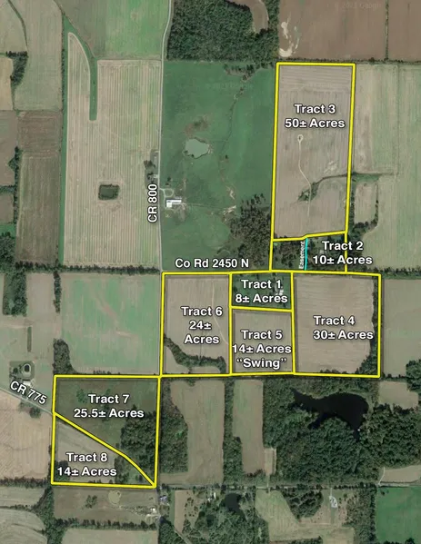 DIRECTIONS TO THE BURNT PRAIRIE/CENTERVILLE FARMS (TRACTS 1-9): From Interstate 64 at the Burnt Prairie Exit 117, proceed south on CR 750 E to East on CR 2550. Turn East onto CR 2450 for Tracts 1-6. Continue on CR 800 for Tracts 7 & 8 at the intersection of CR 800 and 775. For Tract 9, proceed East on CR 2400 then South on CR 950. Watch for signs.