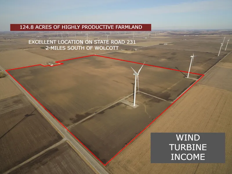 Once in a lifetime opportunity! Highly productive farm, with great soils and nearly all tillable acres; including 2 income producing wind turbines. Great location, 2 miles south of Wolcott, IN on State Road 231.